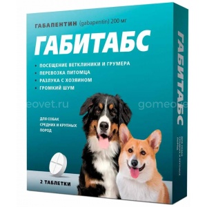 Габитабс 200 мг для собак средних и крупных пород, 2 таб.  применяют для устранения поведенческих расстройств, купирования повышенной тревожности, в том числе при проведении диагностических исследований, транспортировке и груминге у собак и кошек.